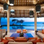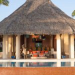 Perched like a crown on a cliff, this waterfront villa masterfully blends modern amenities with native touches like indigenous art and thatched roofing. Terraces surround the main palapa and seem to float over the curved pool, which gazes onto lush gardens and